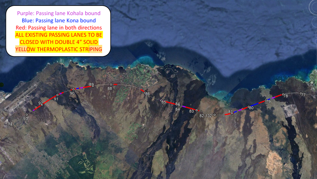 The passing zone removal will enforce safe driving habits and enhance the safety of motorists traveling on the highway. Along this segment of Queen Kaʻahumanu Highway, there have been multiple near misses and crashes related to passing vehicles, with at least two fatalities related to passing vehicles in the past five years.